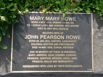 Euroa Cemetery; the plaque on Mary Rowe's grave in St Kilda